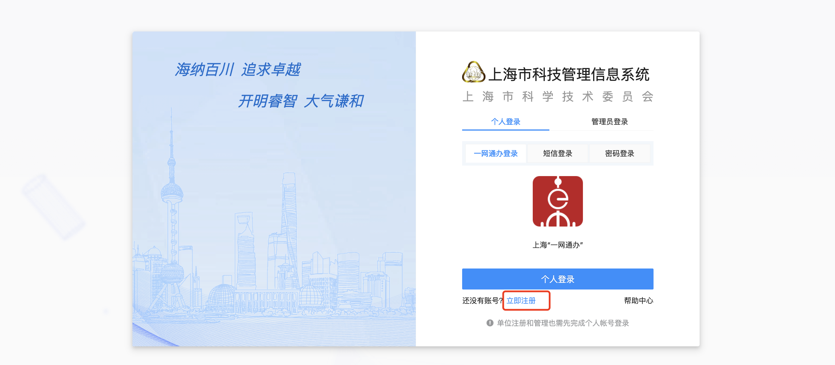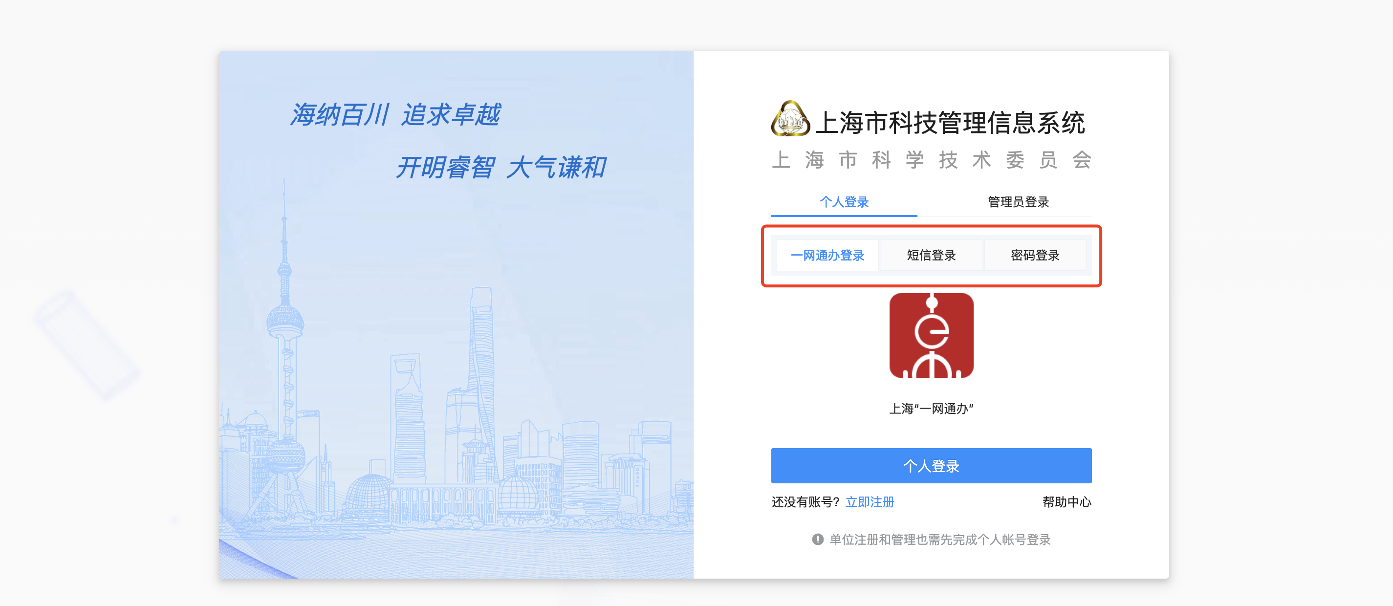 4. 已经注册过上海一网通办账号用户,请点击【上海“一网通办”登录】按钮登录跳转到一网通办网站登录。注意:操作前,请确保一网通办用户已经退出账号;已有上海科技管理信息系统账号也可以使用短信验证码、密码登录。