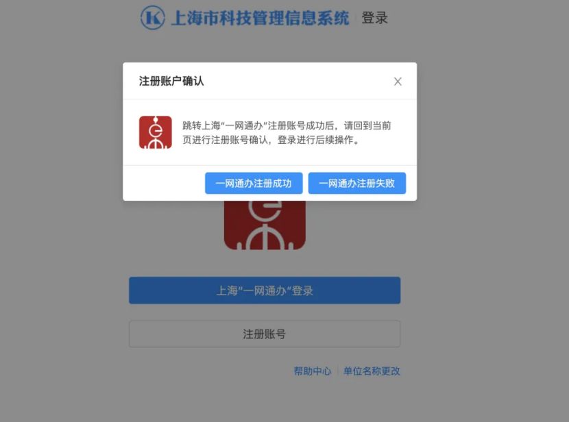 3. 账号注册完成返回上海科技网站,点击【一网通办注册成功】按钮完成一网通办授权登录,如果注册失败点击【一网通办注册失败】按钮继续一网通办注册账号,如一网通办账号注册或实名遇到问题请电话联系:021-12345。