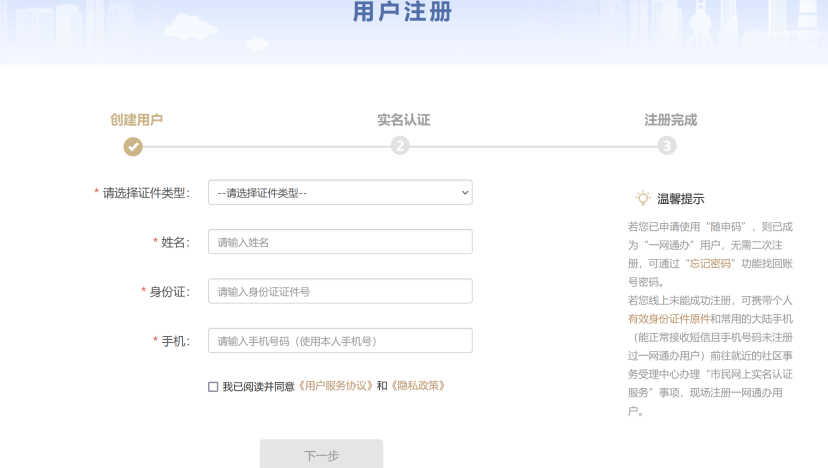 2. 一网通办账号注册如下图,请选择对应的证件类型注册,如一网通办账号注册或实名遇到问题请电话联系:021-12345。