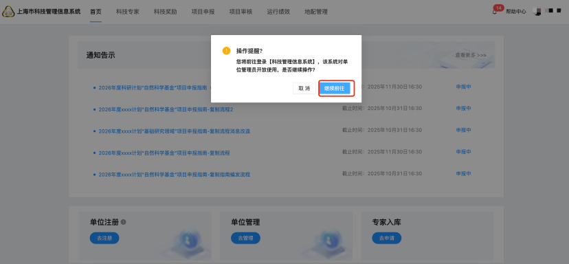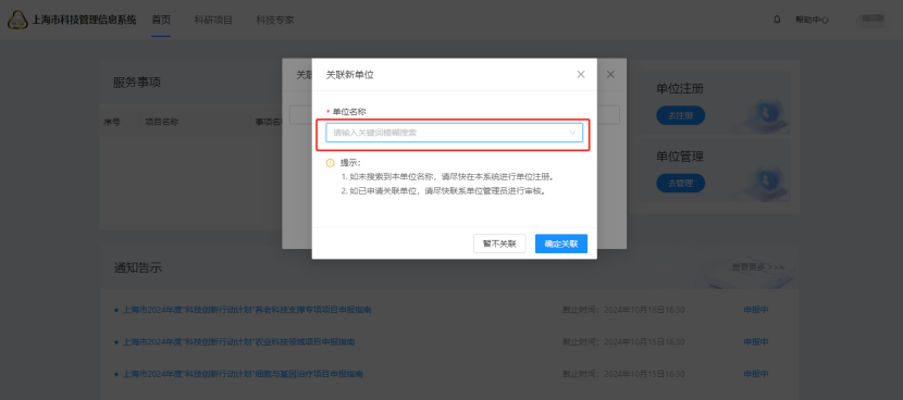 第三步:点击“继续前往”,跳转到单位关联页面;